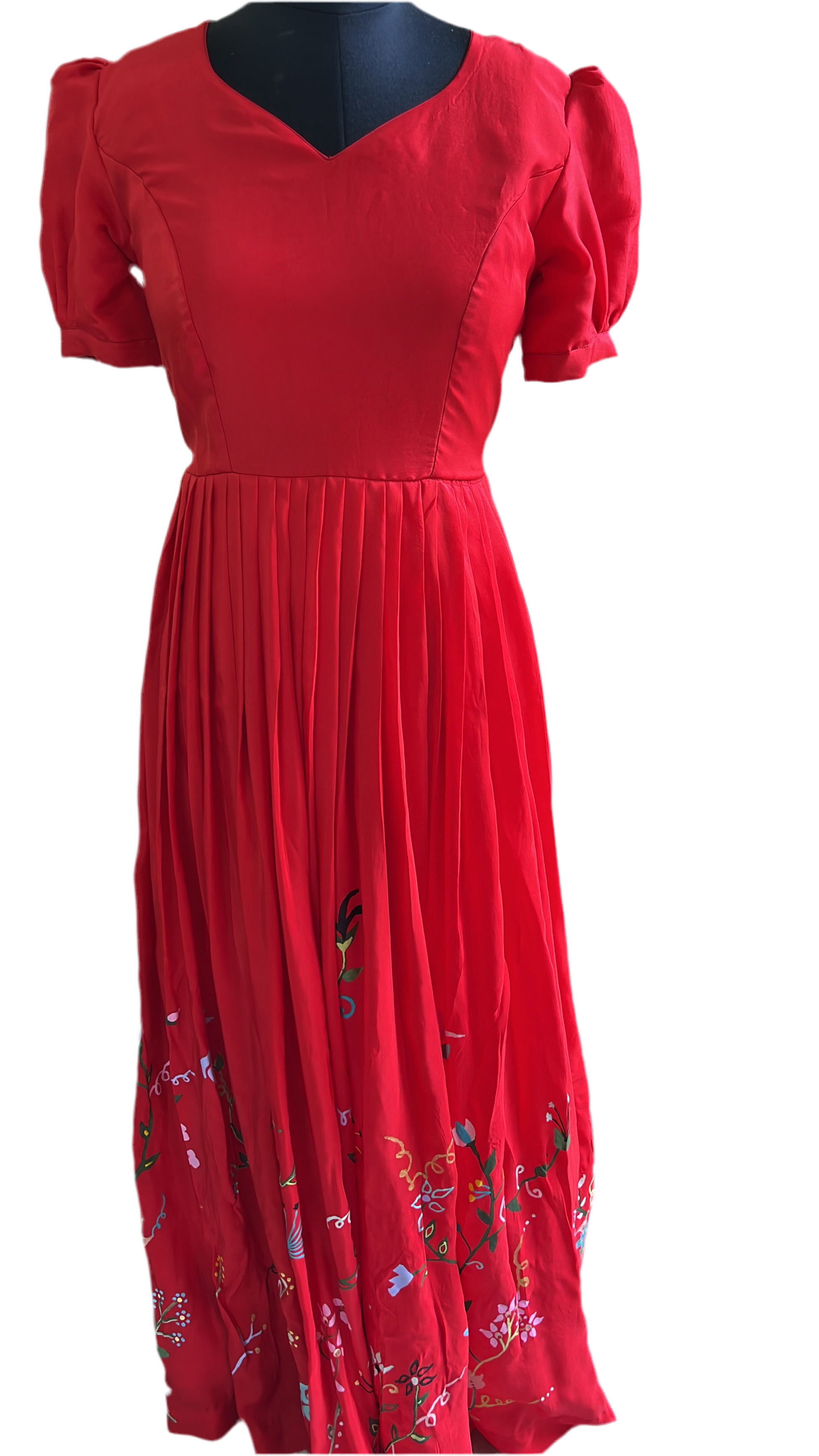 “Elegant Red Pleated Gown with Hand-Painted Floral Art”