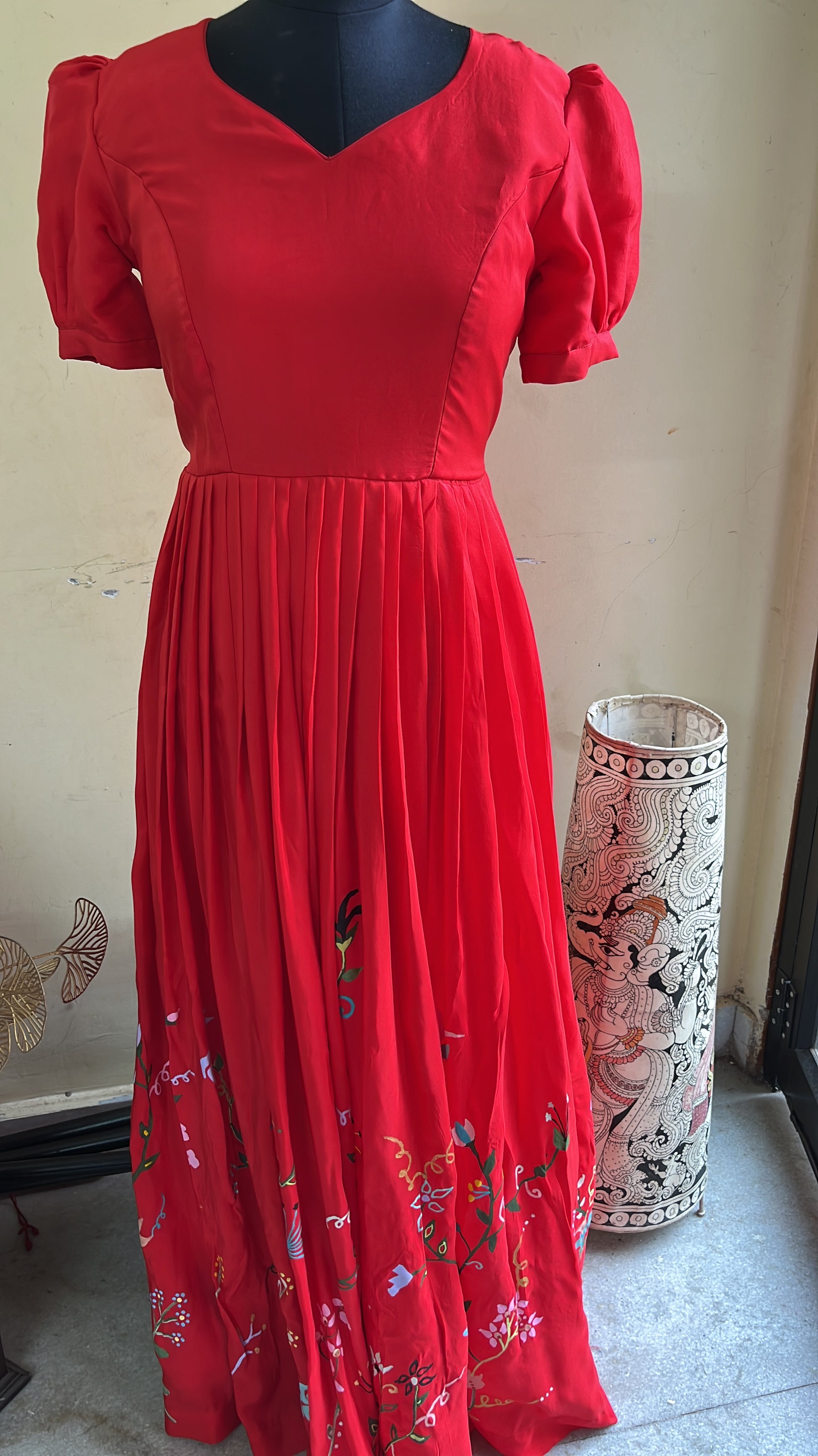 Turn heads with this stunning red gown, a perfect blend of tradition and contemporary elegance. Crafted in rich, flowy fabric, this piece features finely stitched pleats that add graceful movement and structure to the silhouette. The highlight is the exquisite hand-painted floral artwork along the lower flare — a true testament to skilled craftsmanship and artistic expression.